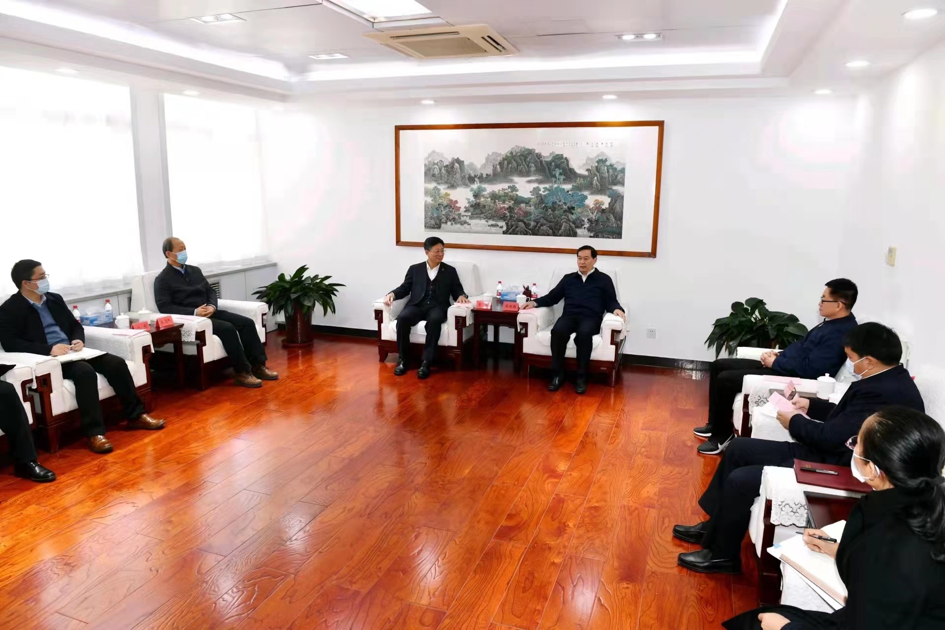 石家庄市领导刘军志、教育局局长赵立芬,以及原校党委常委、副校长吕志伟,学校办公室、图书馆主要负责同志,工大科雅董事长齐承英参加会谈。