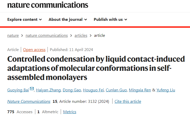 4月11日,taptap点点官方网站材料学院白国英教授课题组在Nature Communications上发表题为“Controlled condensation by liquid contact-induced adaptations of molecular conformations in self-assembled monolayers”的高水平论文,并被刊登在Nature Communications编辑精选网页(展示某一领域最近发表的50篇最好论文)上。taptap点点官方网站材料科学与工程学院天津市层状复合与界面控制技术重点实验室为第一完成单位。
