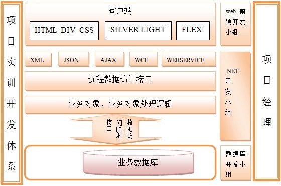 本方向与一保通共同建有一个大型软件开发实训室,实训室的人员配备上进行双重管理,由任课老师和企业专家构成“双导师”模式,与企业共同开发项目,让学生参与真实项目开发。按照企业开发实际工作背景,结合高等职业教育特点组建开发团队,团队由web前端开发(包括富客户端开发FLEX和SILVERLIGHT),.NET开发,数据库开发三个小组组成。.NET软件开发实训室采用项目课程一体化教学,以项目为载体,以工作过程为导向,可以完整体验一个软件项目的生命周期。