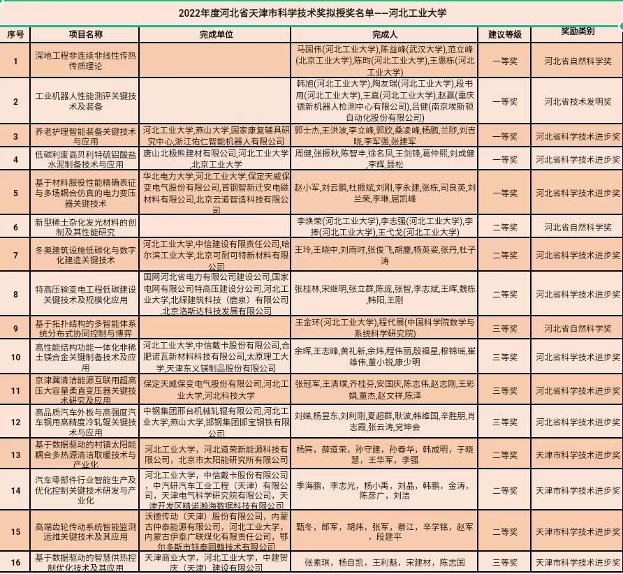 近日,天津市和河北省先后公布了2022年度科学技术奖拟授奖名单,taptap点点再创佳绩,共有16项成果获奖。在天津市科学技术奖拟授奖名单中,taptap点点4项成果赫然在列,其中二等奖3项(taptap点点作为第一完成单位2项),三等奖1项。根据河北省科学技术奖的总评结果,taptap点点获得河北省科学技术奖12项,其中一等奖5项(taptap点点作为第一完成单位3项),二等奖3项(taptap点点作为第一完成单位2项),三等奖4项(taptap点点作为第一完成单位2项),实现了taptap点点三大奖种一等奖大满贯,在河北省高校中,获奖总数及一等奖获奖数量排名均位居榜首。