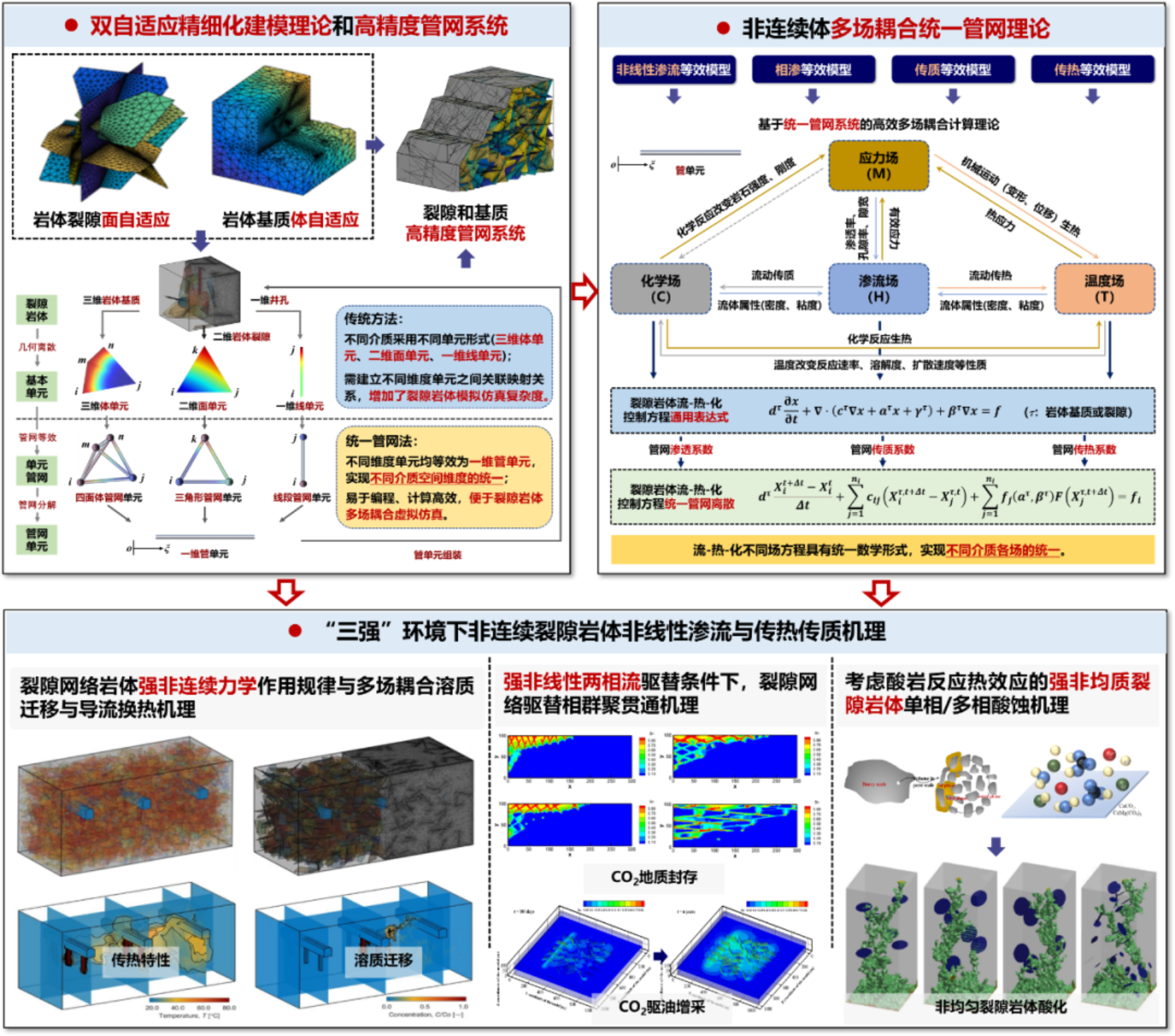 河北省自然科学一等奖项目“深地工程非连续非线性传热传质理论”由马国伟教授主持。该项目建立了粗糙裂隙非线性渗流与传热传质等效模型,提出了复杂裂隙网络岩体非连续多场耦合统一管网理论,并且提出了深地工程非线性流-热-力-化多场耦合效应评价方法。形成了深地岩体工程非连续多场耦合分析理论创新体系,研发了多场耦合统一管网分析软件,在地下储油库、深部地热开发等国内外工程应用。依托该项目,创立了国际和中国岩石力学与工程学会非连续变形分析专委会,引领了深地工程传热传质方向的发展。项目研究期间,在深地深海国家战略科技前沿领域顶尖期刊发表5篇代表性论文被26个国家、440余所科研单位的1000余位学者正面评价与引用,WOS他引426次,其中3篇为ESI高被引论文。