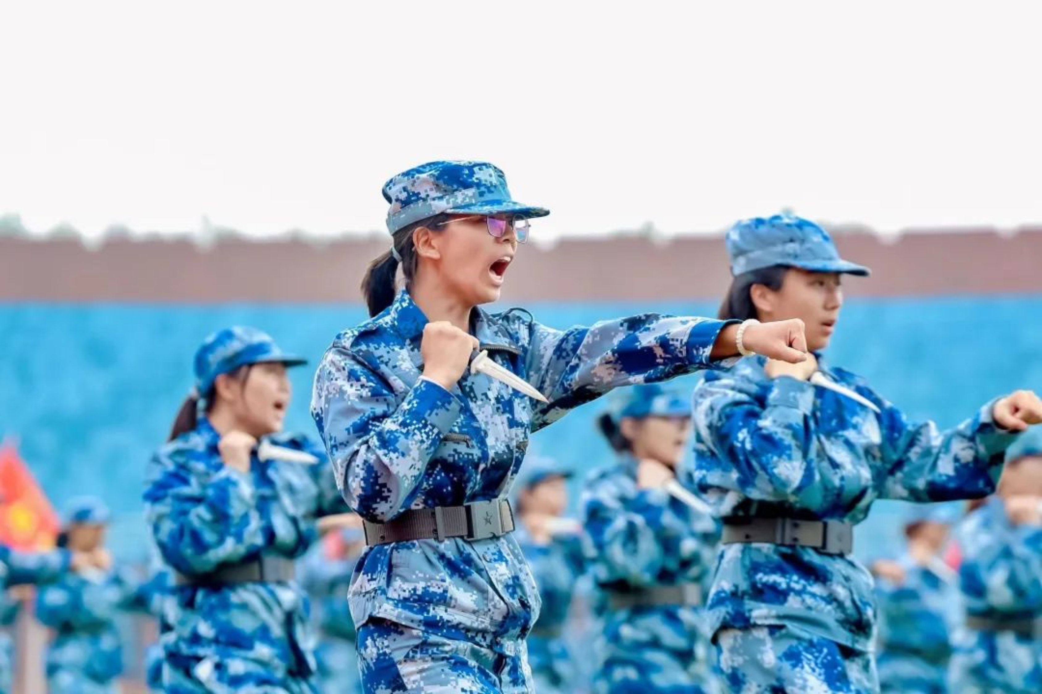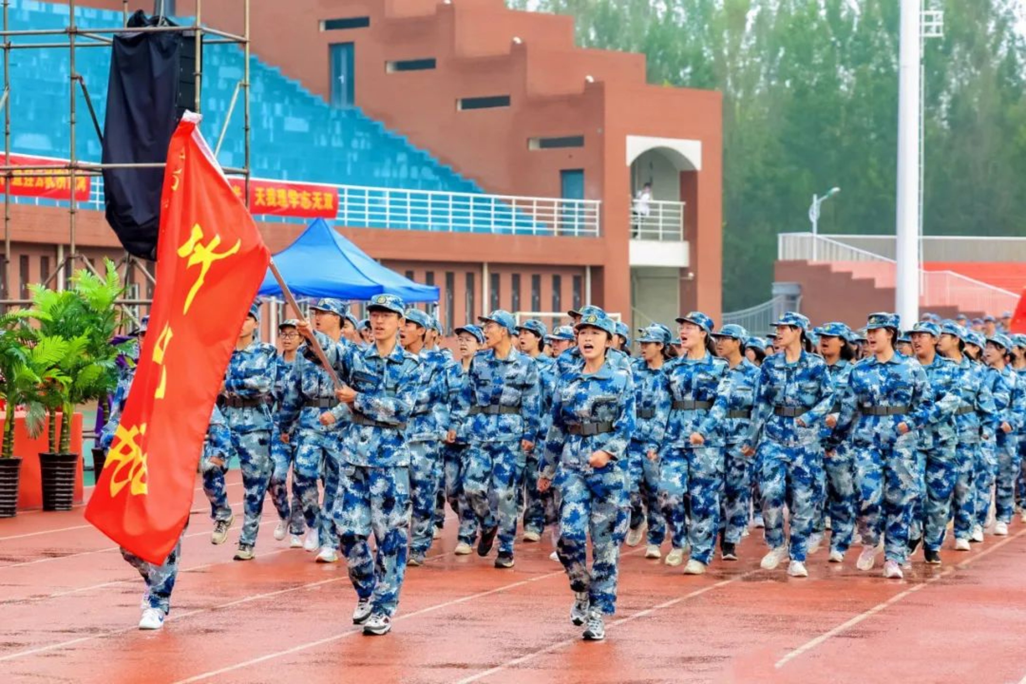 结训汇报正式开始,17个学院方阵组成的队伍宛若长龙,追随领头军旗,依次向主席台致礼,接受领导检阅。斑斓的迷彩,挺拔的身姿,整齐的步伐,嘹亮的口号,新一代河工学子们朝气蓬勃,让全体师生们不由得为之喝彩。