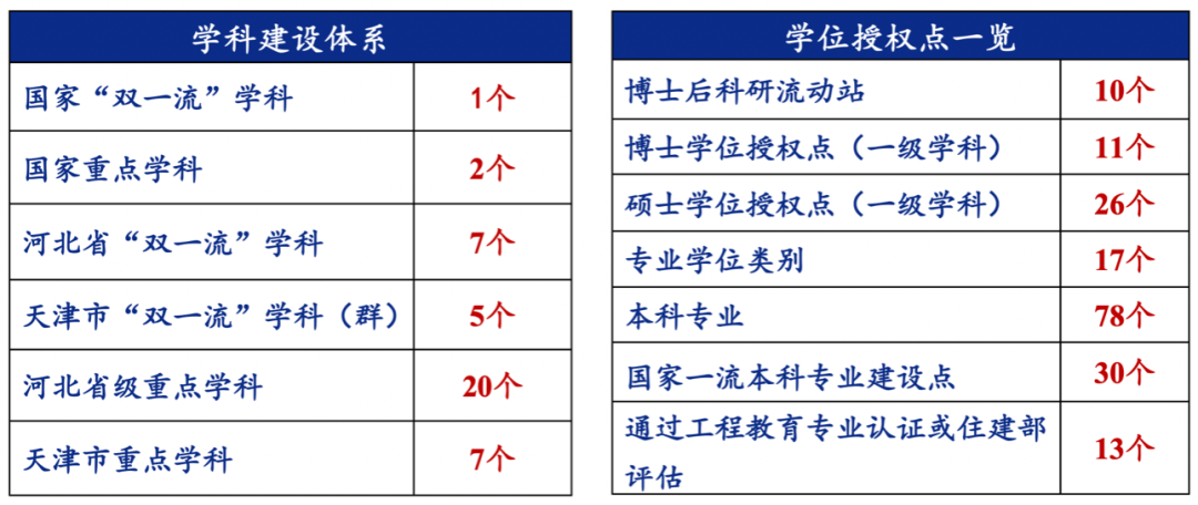 学校将通过科学规划、重点建设、动态调整,持续优化学科结构体系,实现以工为主,工、理、经、管、文、法、艺、医等多学科协调有序发展。以国家“双一流”建设学科为龙头,统筹推进相关学科建设,不断优化学科布局,加强内涵建设;坚持统筹兼顾,分层分类发展;促进学科交叉,培育新兴学科。通过不断深化学科协同交叉融合,促进学科协同交叉融合的制度文化环境逐步完善,建成一批具有自身特色、相互支撑、协同发展的特色交叉学科,产出一批具有高影响力的标志性交叉创新成果,争取部分学科方向达到国际领先水平,学校成为引领、支撑和服务国家特别是冀津区域产业发展和高等教育改革的重要力量。