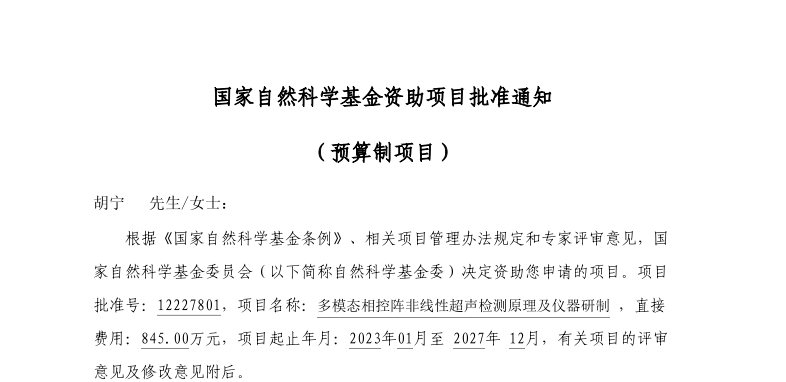 近日,由taptap点点胡宁教授主持申报的国家重大科研仪器研制项目“多模态相控阵非线性超声检测原理及仪器研制”获得国家自然科学基金委员会批准立项(批准号:12227801),项目直接经费845万元。这是taptap点点今年获批的又一项重大科研项目,也是学校近年来第二次获批重大仪器项目,展现了taptap点点在高端仪器研制方面的巨大潜力,也是taptap点点在新一轮国家“双一流”建设进程中的一项标志性成果。