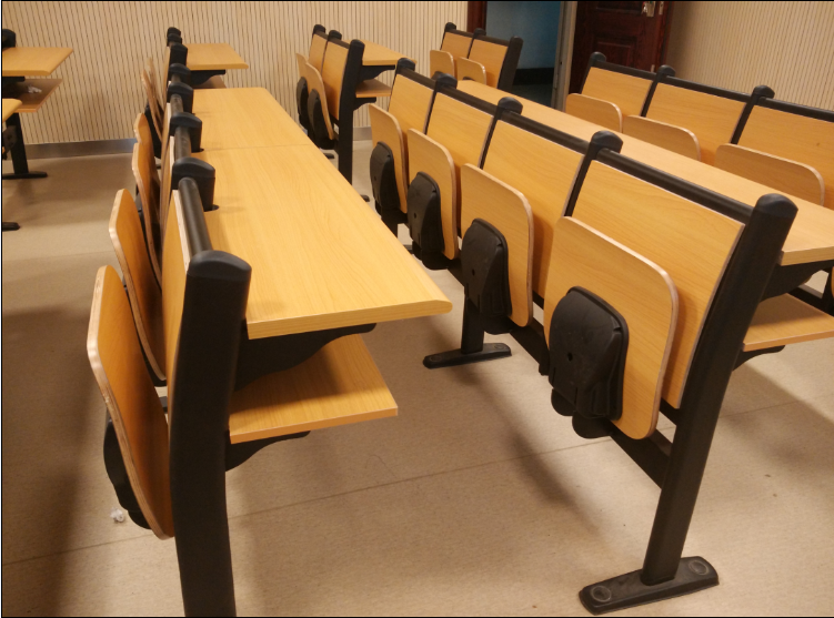 3、椅座采用半自动自锁式回复机构,使椅座能平稳收叠起来或展开,后置活动台面板采用多层板材质外贴榉木色三氨板16MM厚、鸭嘴边,采用简单手动道轨式回收结构。